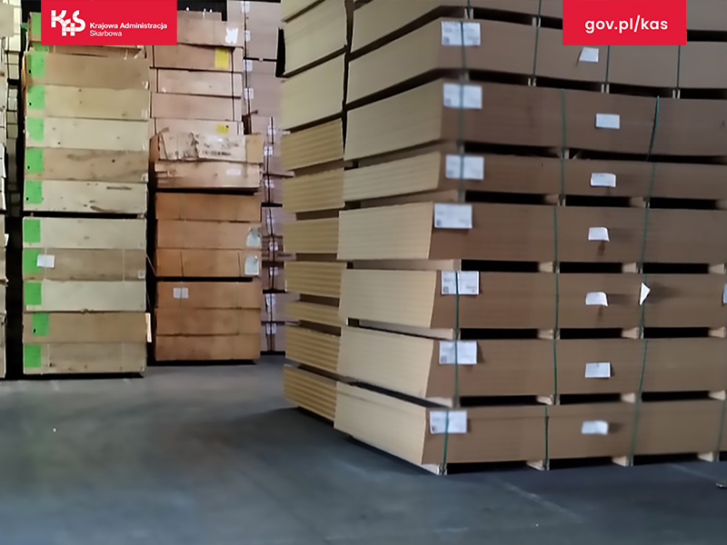 Przeszukano miejsca zamieszkania podejrzanych, pomieszczenia biurowe oraz hale magazynowe w woj. mazowieckim, wielkopolskim i podlaskim. Zabezpieczono m.in. dokumentację księgową, sprzęt elektroniczny oraz sklejkę, która znajdowała się w magazynach. Pobrano również próbki towaru do badań laboratoryjnych.