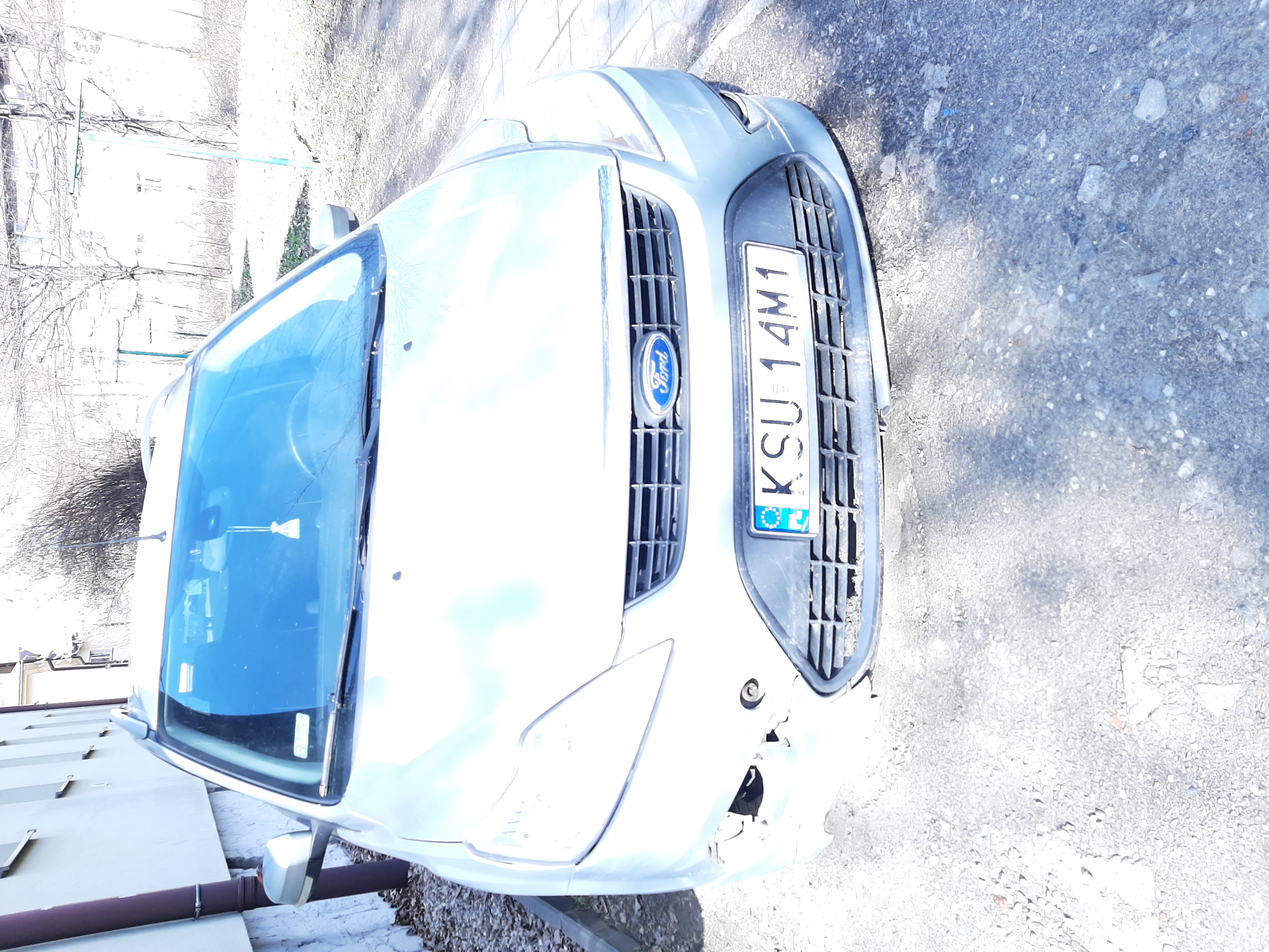Samochód osobowy Ford Focus w kolorze srebrny metalik. Pojazd jest uszkodzony, poprzebijane opony.
