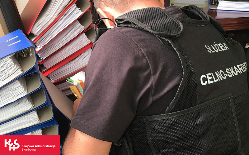 Mężczyzna tyłem, na plecach napis Służba Celno-Skarbowa ,w tle segregatory.
