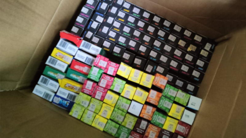 Funkcjonariusze zatrzymali mężczyznę i zabezpieczyli jednorazowe e-papierosy, papierosy i mokry tytoń do palenia (tzw. melasa) bez znaków akcyzy oraz podrobione perfumy. Dodatkowo znaleźli opakowania żelków do ssania z zawartością substancji czynnej THC.