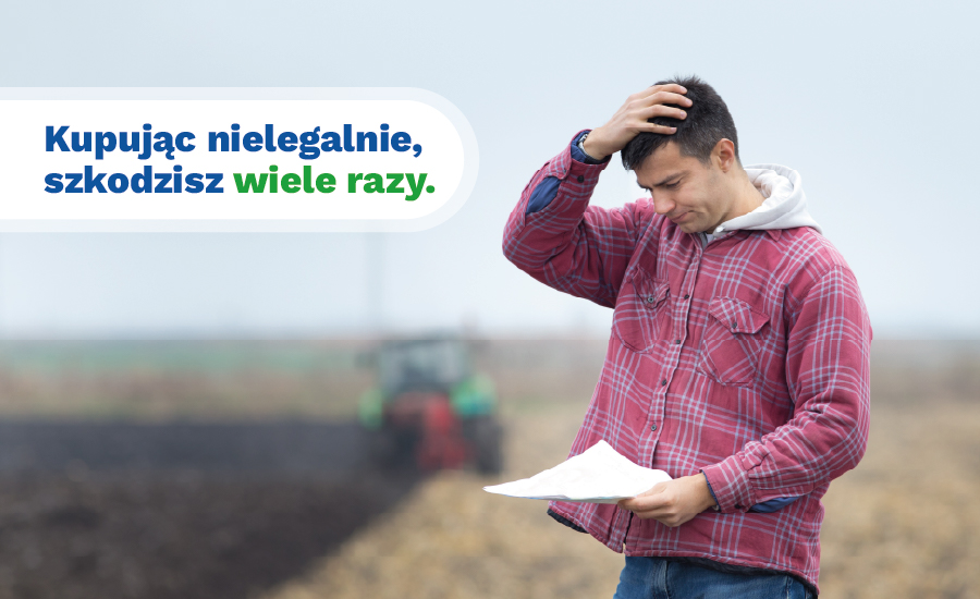 Mężczyzna na polu ze zmartwionym wyrazem twarzy trzyma dokument, obok napis o szkodliwości nielegalnych zakupów.