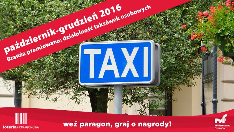 Taksówkarz po wykonaniu usługi ma obowiązek wydać klientowi paragon fiskalny. Przypominamy, że działalność taksówek osobowych jest w IV kwartale 2016 r. branżą premiowaną w Narodowej Loterii Paragonowej Ministerstwa Finansów. Oznacza to, że każdy kto na stronie www.loteriaparagonowa.gov.pl (link otwiera nowe okno w innym serwisie) zarejestruje paragon od taksówkarza będzie mieć szansę na wygranie Opla Insigni.