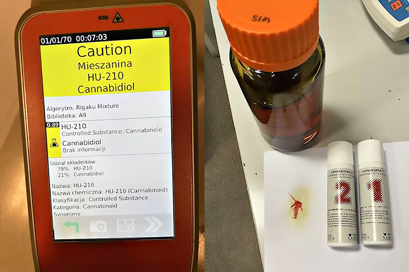 Po otwarciu paczki, w kartonowym pudle z etykietą adresową, był tylko jeden t-shirt oraz…litrowy słoik z żywicą. Substancję poddano wstępnym badaniom spektrometrem i narkotestem.